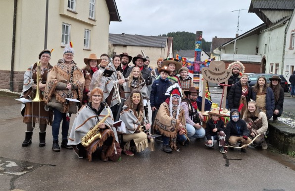 Alle Jahre wieder - unser Musikverein mit dabei beim Rosenmontagsumzug in Gladbach. Die Jungmusiker zogen mit ihrem selbstgestalteten Totempfahl vorne weg und warfen Kamelle. Dahinter erklangen